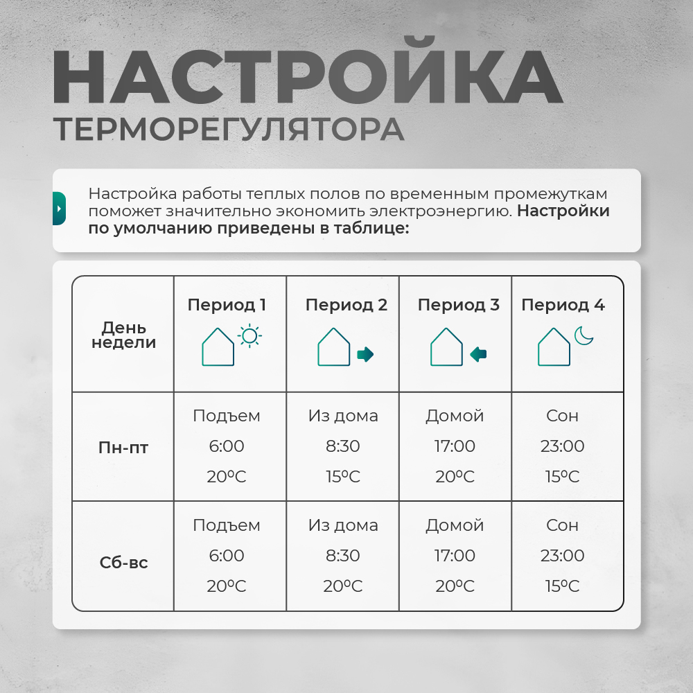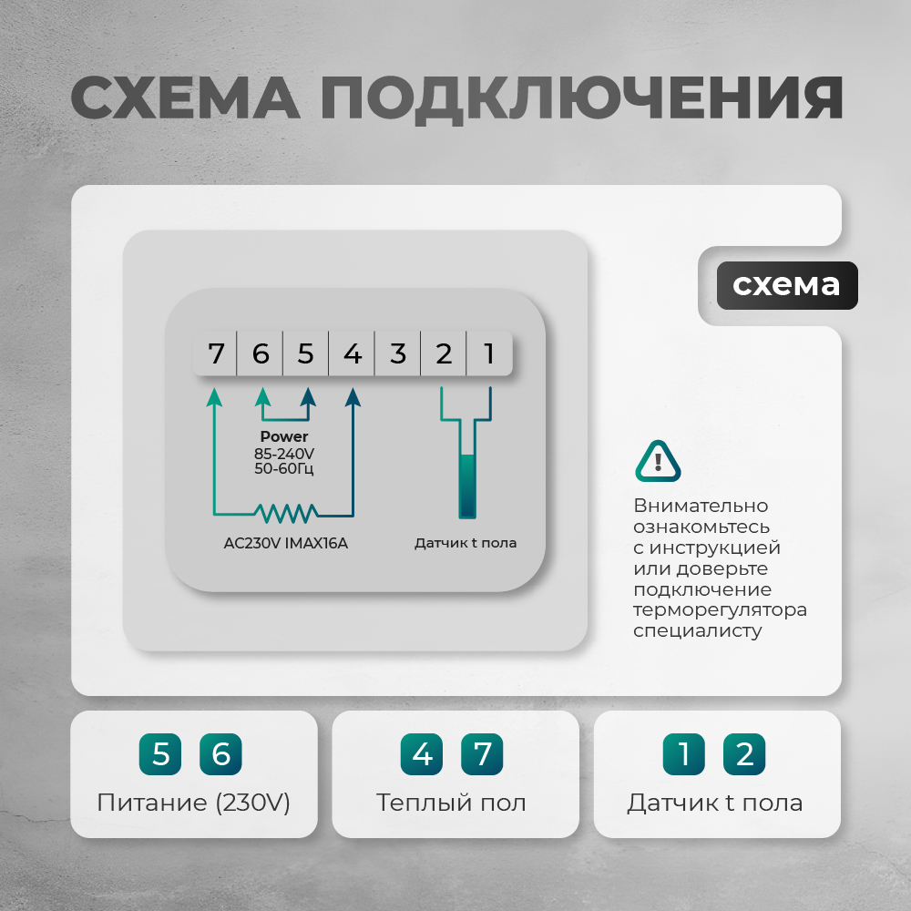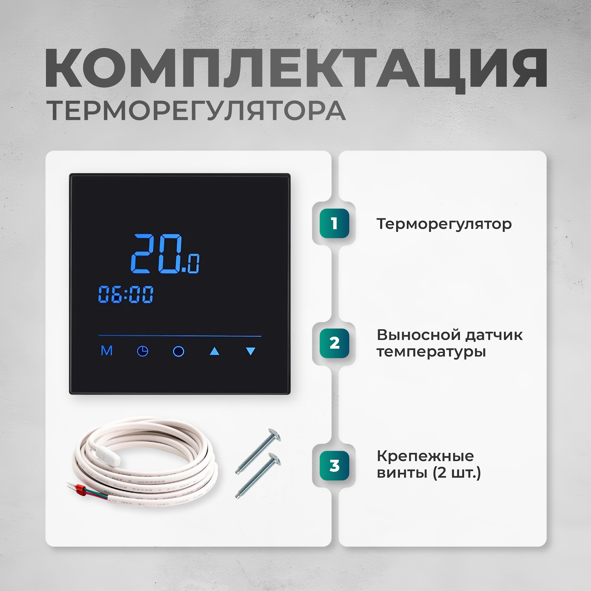 Терморегулятор совместим со всеми типами электрических теплых полов до 3500 Вт и имеет гарантию на 1 год. Комплектация включает в себя терморегулятор, инструкцию, крепления (болты – 2 шт.), и кабель (датчик) для теплого пола.