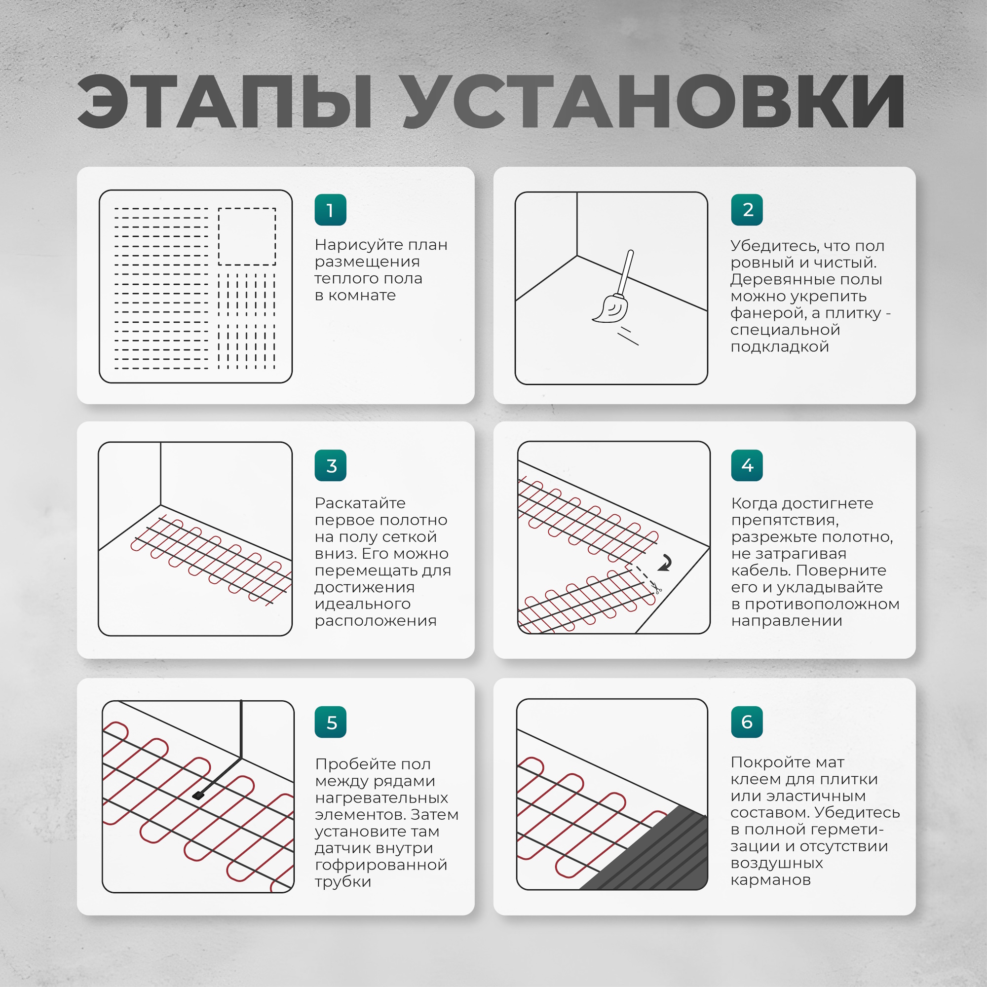 Широкий ассортимент. Нагревательные маты Bejert имеют стандартную ширину 0,5 метра. Длина матов зависит от площади, которую необходимо обогреть. Например, для площади 2,5 квадратных метров необходим мат длиной 5 метров (0,5 м * 5 м); для 3,5 квадратных метров - мат длиной 7 метров (0,5 м * 7 м). И так далее, в зависимости от нужной площади. Вы можете разрезать сетку матов и отделить греющий кабель, чтобы адаптировать их к конкретным потребностям монтажа. Однако ВАЖНО помнить, что НЕ ДОПУСКАЕТСЯ производить разрезание, уменьшение или увеличение греющего кабеля, чтобы избежать повреждения системы обогрева.