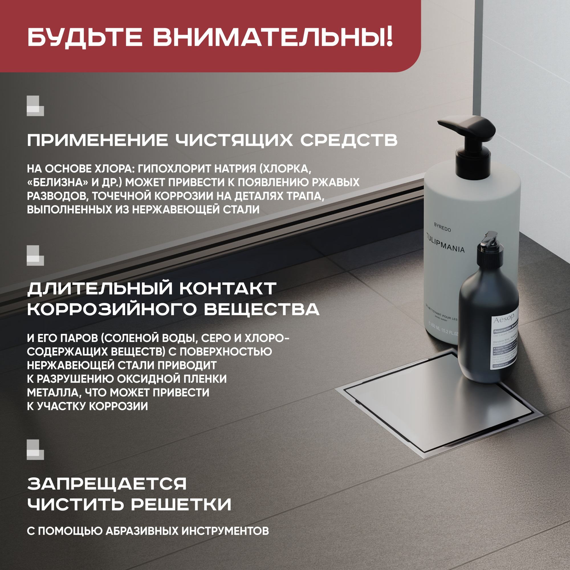 Трапы канализационные должны использоваться только во внутренних помещениях. При необходимости нужно производить снятие решетки и механического «сухого» затвора для очистки внутренней полости от грязи и мусора. При этом следует избегать чистки лицевой стороны решетки и рамки абразивными средствами, чтобы сохранить их внешний вид и качество.