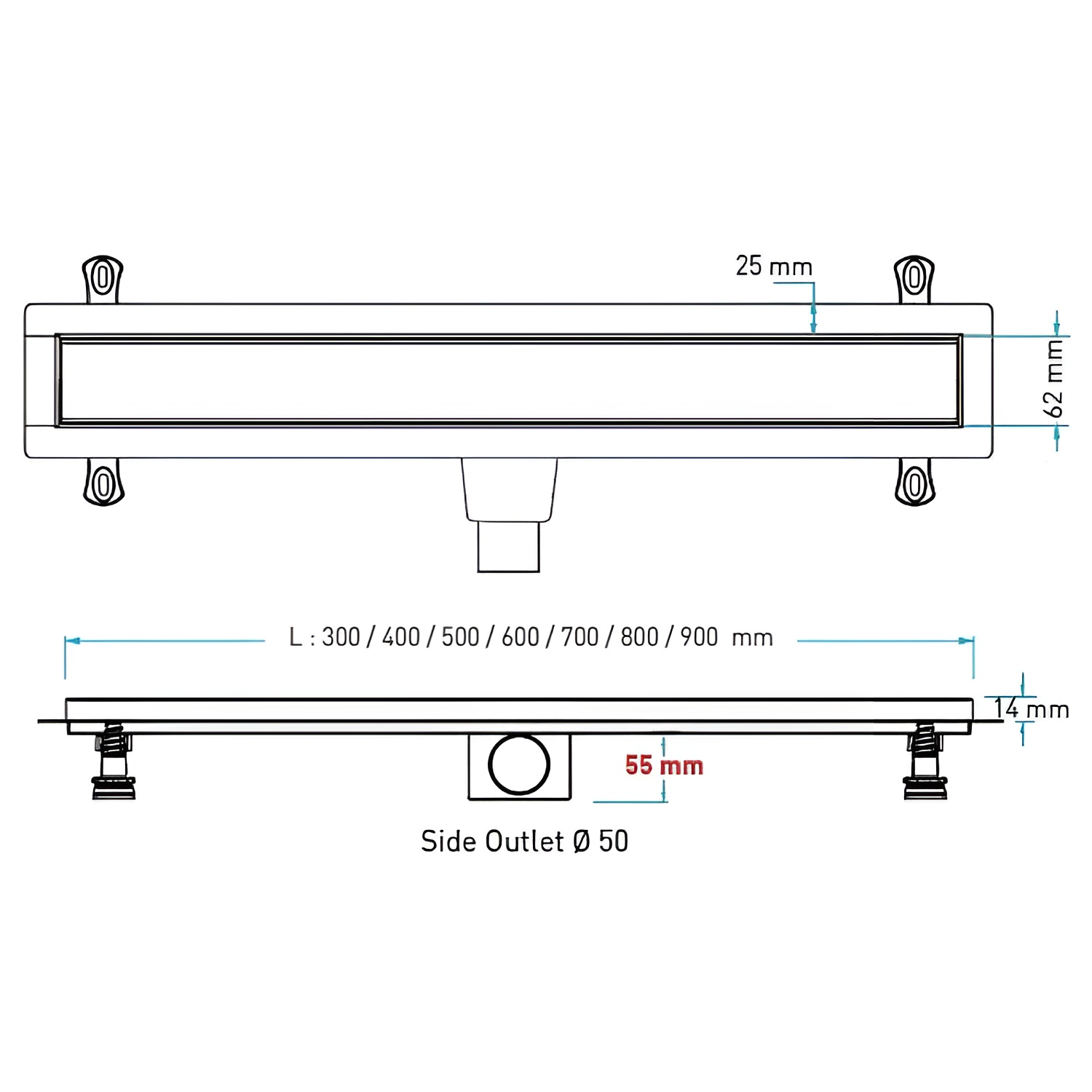 Дренажный канал имеет выходной диаметр 50 мм, а его длина составляет 850 мм. Длина решетки 800 мм и ширина 62 мм, имеется внутренний наклон водостока. Полная ширина изделия с учетом ободка - 112 мм. Запахозапирающее устройство оснащено комбинированным затвором ("сухим" и гидрозатвором), обеспечивающим надежную блокировку запахов, а также водонепроницаемой прокладкой и грязеуловителем.