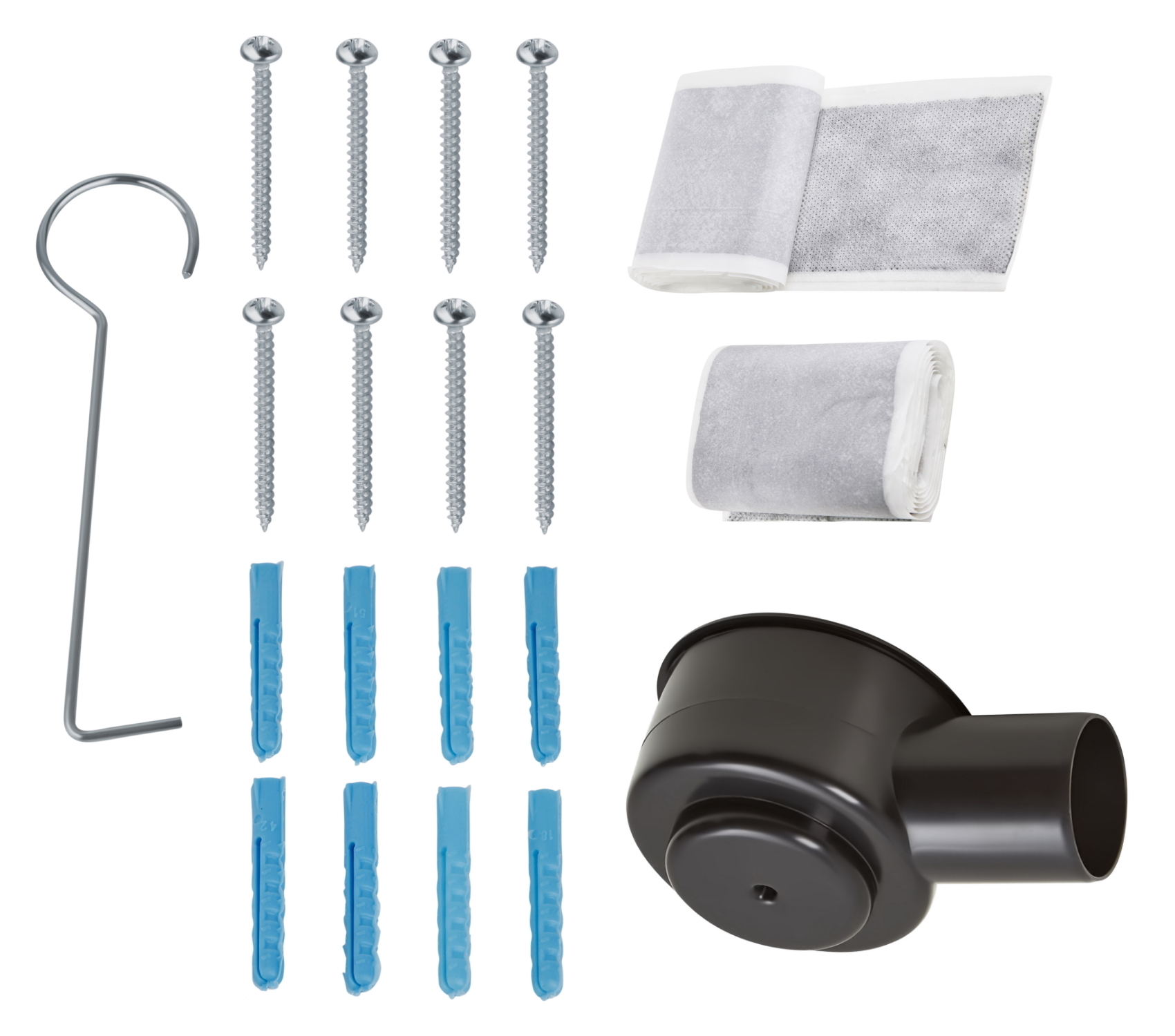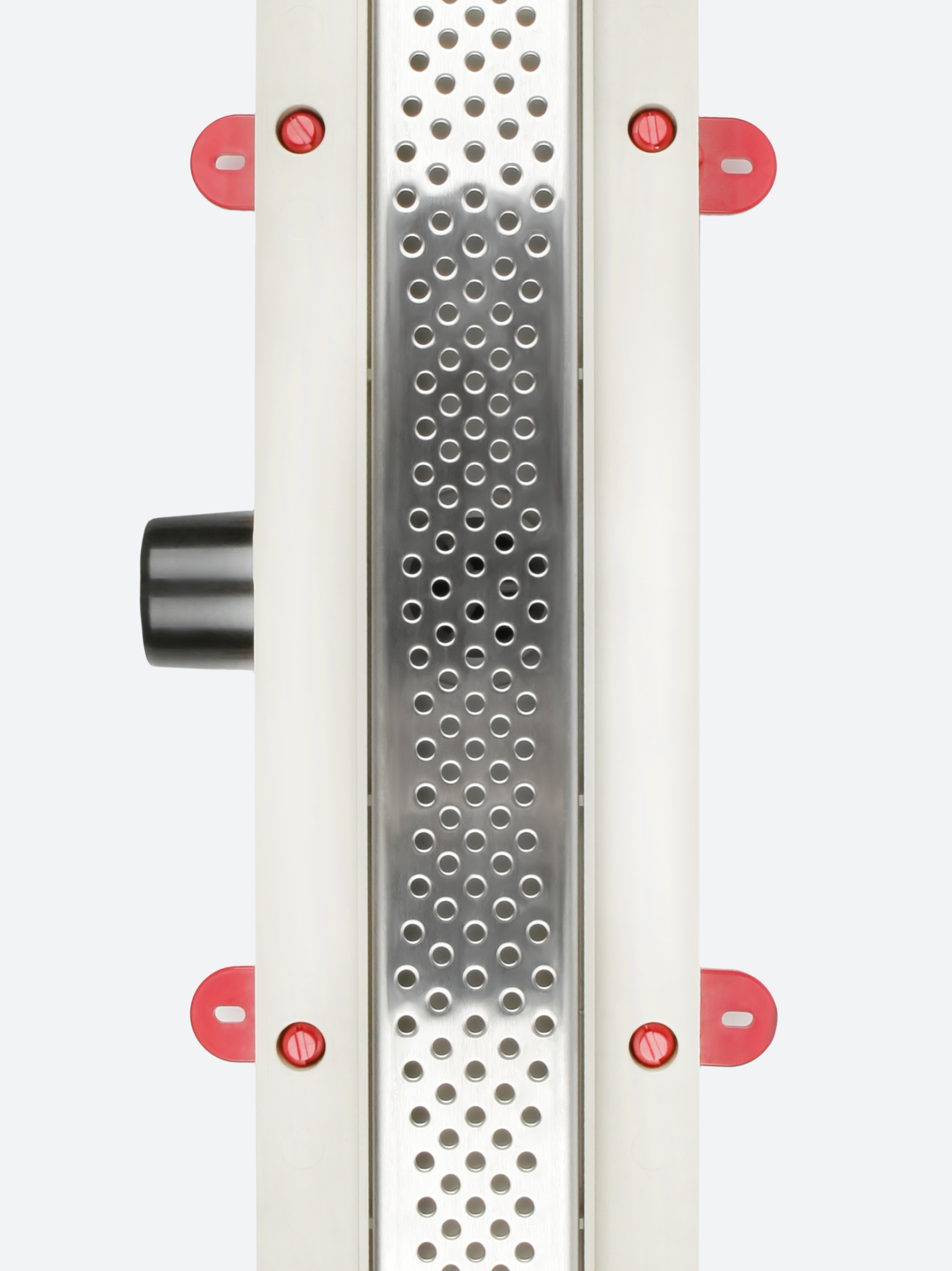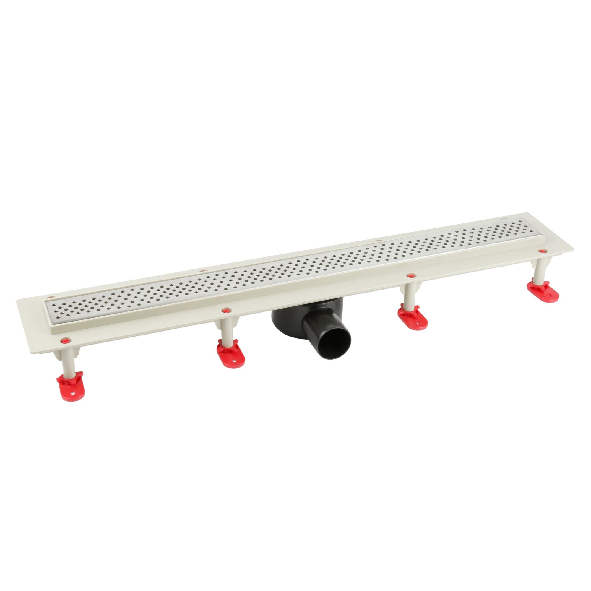 В комплект поставки входят решетка из нержавеющей стали, корпус трапа из ABS-пластика с рамкой из нержавеющей стали, регулируемые опоры (8 шт.), сифон, механический "сухой" затвор и колпачок гидрозатвора. Также в комплект поставки входит набор крепежа, герметизирующая лента и крючок для извлечения декоративной решетки из корпуса трапа.
