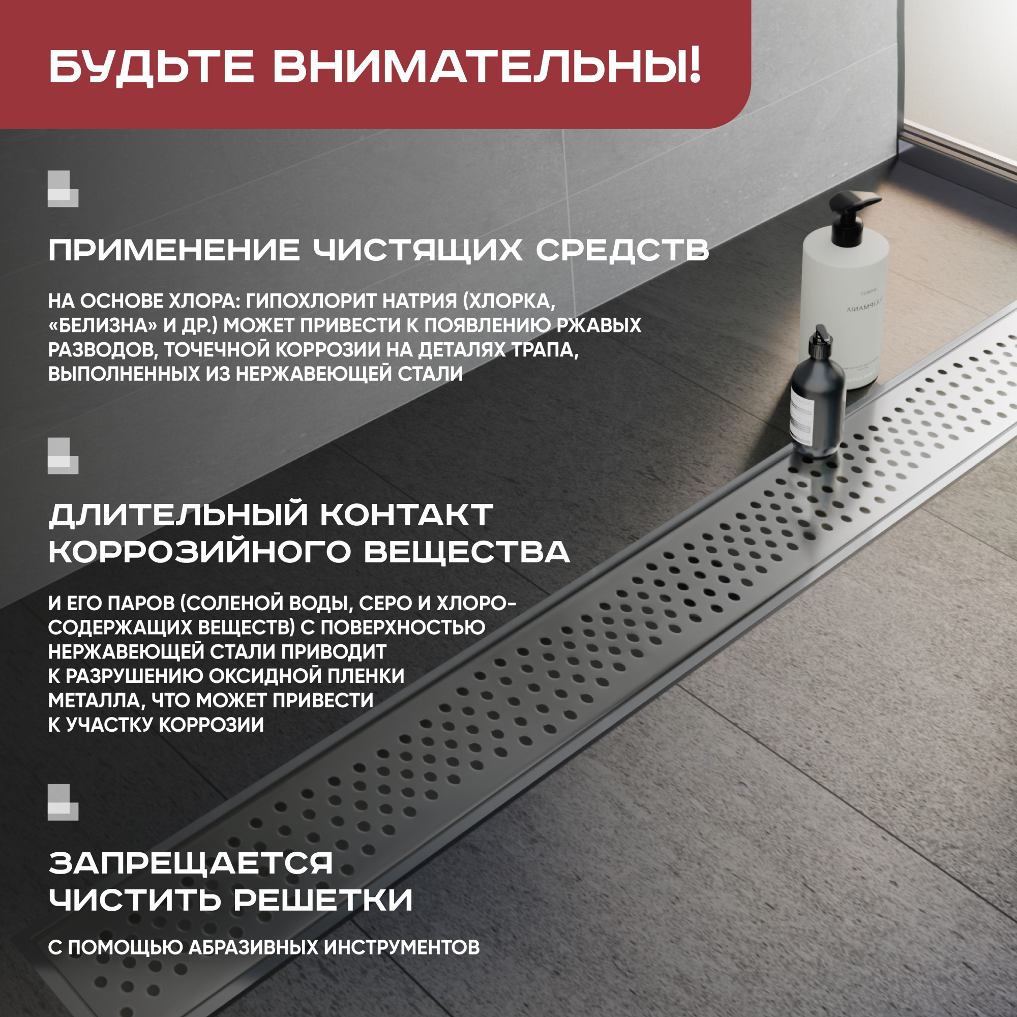 Трапы канализационные не должны использоваться при температурах, не указанных в техническом паспорте. При необходимости производить снятие решетки и механического «сухого» затвора для очистки внутренней полости от грязи и мусора. При этом следует избегать чистки лицевой стороны решетки и рамки абразивными средствами, чтобы сохранить их внешний вид и качество.
